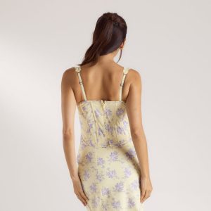 Floor-length maxi dress Corset-style, no boning Ruched cup detailing Soft woven fabrication Lace trim to neck edge and shoulder Lined fabric with floral print detail Adjustable tie shoulder details Lace-up back detail Invisible zip fastening to side