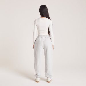 High-waisted sweatpants Soft cotton with fleece lining Scrunchie elasticated waistband Invisible drawstring waistband Gathered ankle cuffs Straight-leg fit with side pockets Vinyl Lounge logo