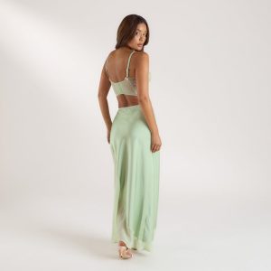 Satin maxi skirt with sheer chiffon panel Contrast picot edging and satin bow Invisible zip fastening to side Matching longline bra Boning channels to each side for added structure Mesh fabrication with satin and embroidered details Wired, darted cup Mesh lining for added coverage Contrast picot edging and satin bow de