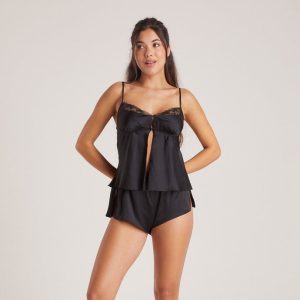 Satin, cami-style Pajama top Bow-inspired embroidery along neckline Satin-covered buttons to front Adjustable satin straps Satin underbust channel with gathered cups for light shaping Fastens with 2 buttons to top