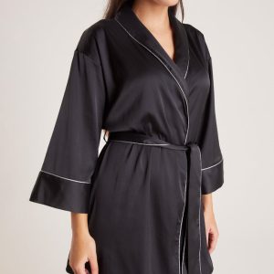 Short length, relaxed fit Soft, luxurious satin fabrication Embroidered Lounge logo to chest Wrap robe with tie waist Silver sparkle piping detail to collar, cuffs, and length of robe