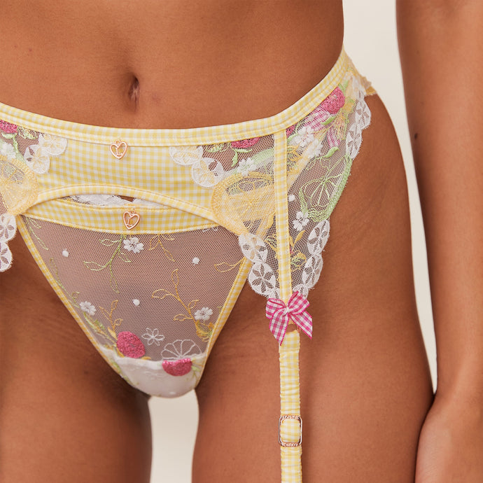 Stop and stare at the Adelina Intimates Set. You'll be feeling fresh with this set's fruity embroidery and delicate bow details. This set truly is the star of the show. Underwired bra, no padding Fruit-inspired embroidery with gingham satin fabrication Ruched gingham satin strapping Contrasting gingham bows and rose go