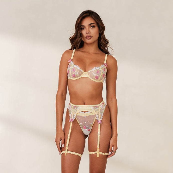 Stop and stare at the Adelina Intimates Set. You'll be feeling fresh with this set's fruity embroidery and delicate bow details. This set truly is the star of the show. Underwired bra, no padding Fruit-inspired embroidery with gingham satin fabrication Ruched gingham satin strapping Contrasting gingham bows and rose go