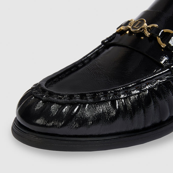 Soft, flexible moccasin construction Crinkled patent leather Pleated detail Stitch detail to base of sole Engraved Lounge logo to sole Snaffle trim with 'L' logo branding Full leather upper Full leather internals Anti-slip texture
