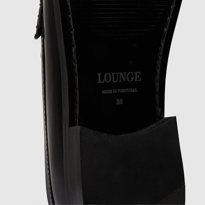 Soft, flexible moccasin construction Crinkled patent leather Pleated detail Stitch detail to base of sole Engraved Lounge logo to sole Snaffle trim with 'L' logo branding Full leather upper Full leather internals Anti-slip texture