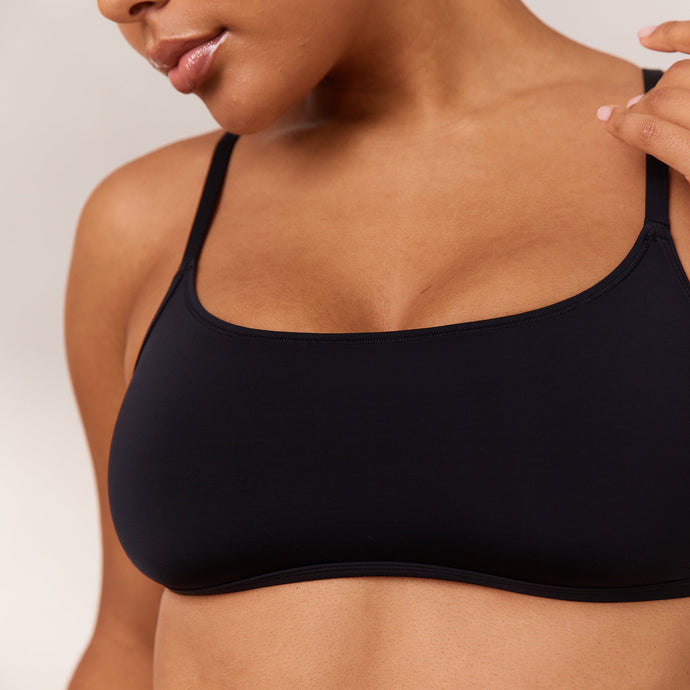 Non-wired bralette, non-padded cups Supportive mesh lining Soft-stretch material Semi-sheer fabrication Subtle silicone Lounge branding Comfortable, weightless feel 78% recycled polyamide, 22% elastane It’s Barely There.It’s also double-lined, minimally branded, bigger-bust-approved, weightlessly supportive, seamlessly