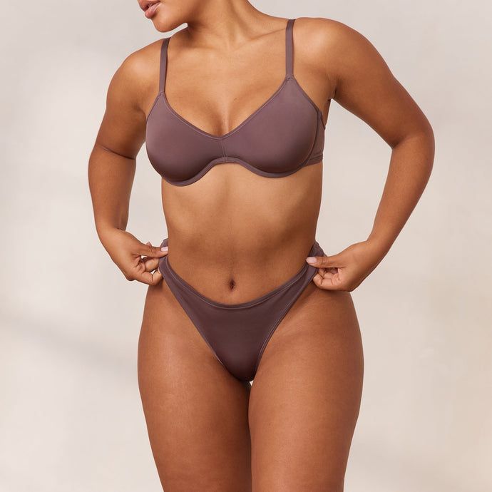 Underwired bra with moulded, non-padded cups Supportive mesh lining Soft-stretch material Semi-sheer fabrication Subtle silicone Lounge branding Comfortable, weightless feel 78% recycled polyamide, 22% elastane It’s Barely There. It’s also double-lined, flexi-wired, minimally branded, bigger-bust-approved, weightlessly