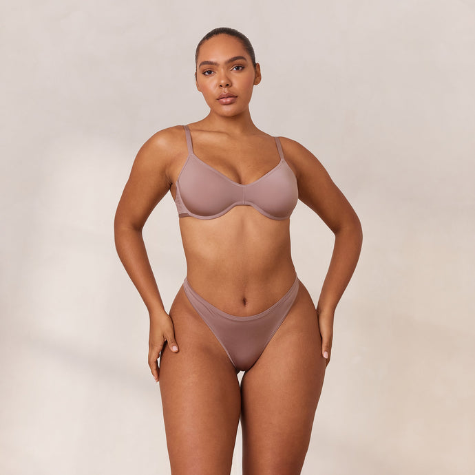Underwired bra with moulded, non-padded cups Supportive mesh lining Soft-stretch material Semi-sheer fabrication Subtle silicone Lounge branding Comfortable, weightless feel 78% recycled polyamide, 22% elastane It’s Barely There.It’s also double-lined, flexi-wired, minimally branded, bigger-bust-approved, weightlessly