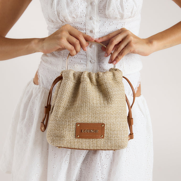 Raffia and tan leather fabrication mix Drawstring fastening Removable leather shoulder strap Full tumbled leather fabrication with light texture Simple textile internals Small interior pocket with branded leather tab Modern minimal metal ring handle Branded 'L' trim to drawstring strap Protective studs to base Leather