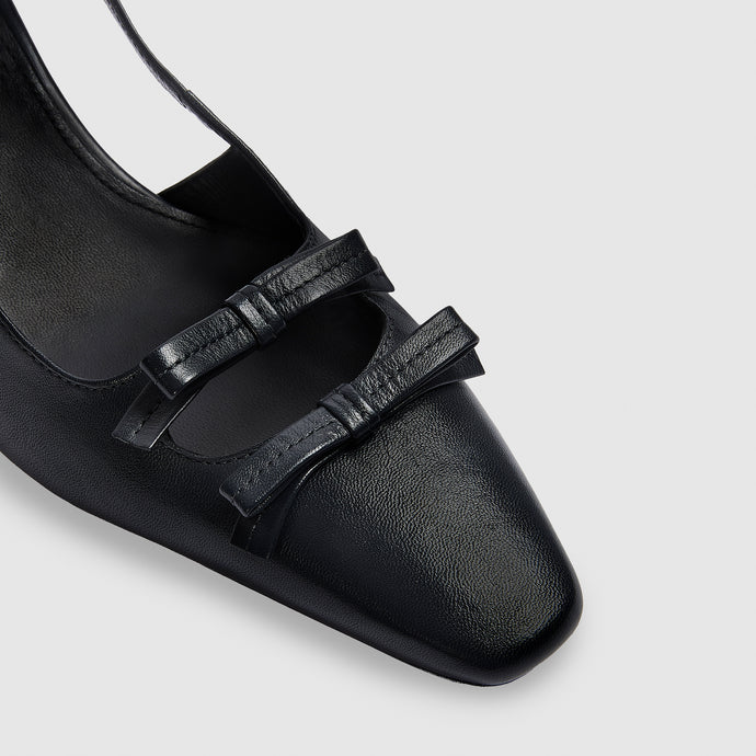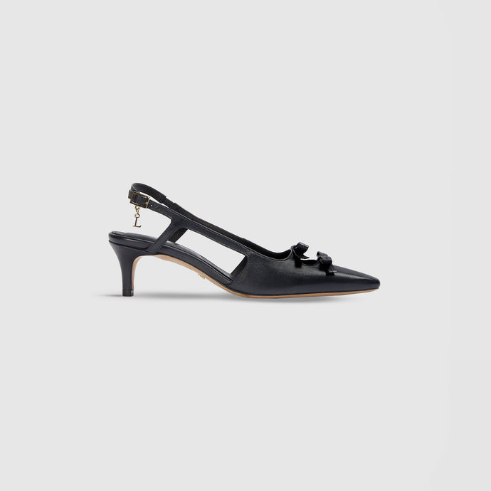 Kitten heel Soft pointed toe Double bow to front with cut-out detail Stitching detail to bows Gold 'L' metal pin to undersole Buckle detail with miniature hanging 'L' charm Engraved Lounge logo to sole Foil Lounge logo to insock Elasticated slingback for added security Full leather upper and internals Super-soft premiu