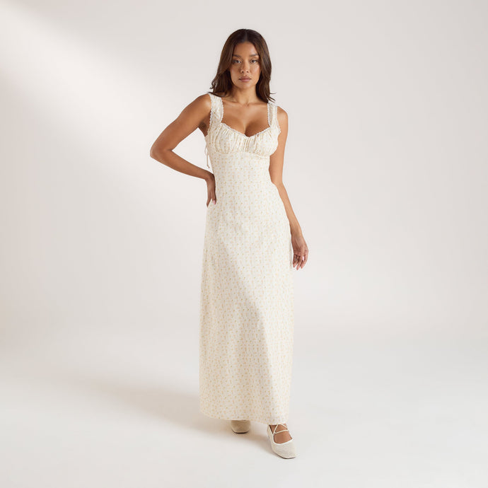 Floor-length maxi dress Corset-style, no boning Ruched cup detailing Soft woven fabrication Lace trim to neck edge and shoulder Lined fabric with floral print detail Adjustable tie shoulder details Lace-up back detail Invisible zip fastening to side
