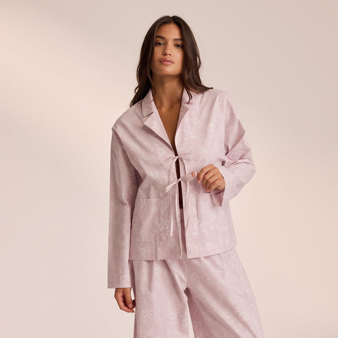 Oversized Pajama shirt Relaxed collar for additional comfort Drop-shoulder style for a relaxed look Double tie front fastening Front pockets on each side Wide hem detailing