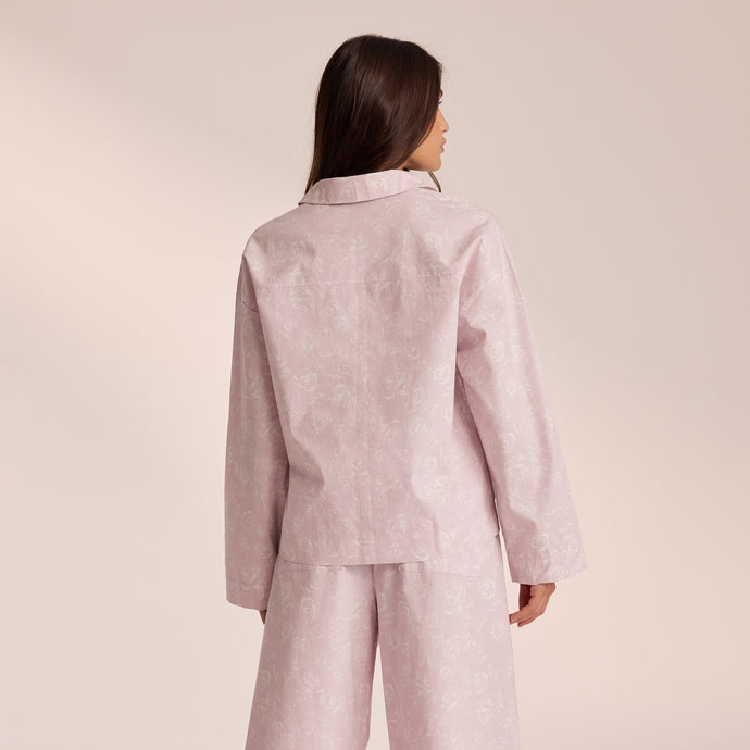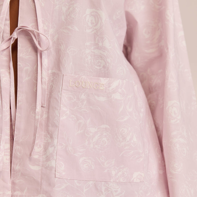 Oversized Pajama shirt Relaxed collar for additional comfort Drop-shoulder style for a relaxed look Double tie front fastening Front pockets on each side Wide hem detailing