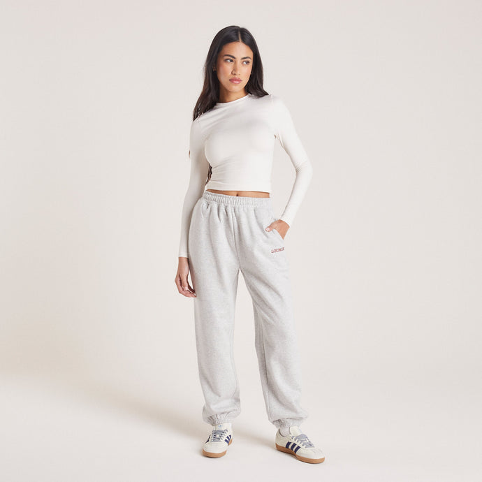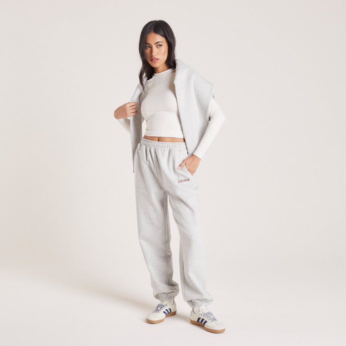 High-waisted sweatpants Soft cotton with fleece lining Scrunchie elasticated waistband Invisible drawstring waistband Gathered ankle cuffs Straight-leg fit with side pockets Vinyl Lounge logo