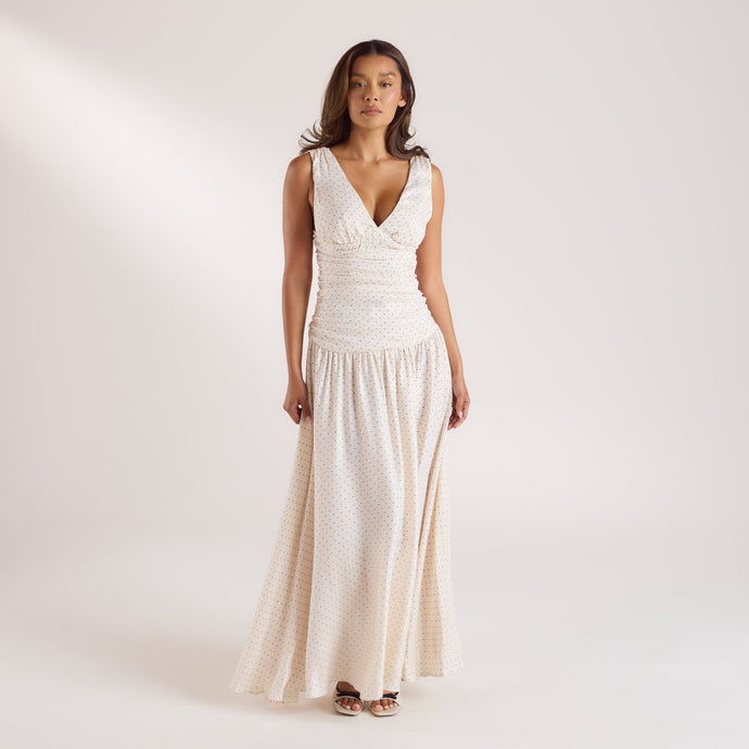 Invisible side zip Lined with logo-branded jacquard lining Ruched detail to shoulders Ruched gathered waist detail Gathered volume skirt with handkerchief hem Sustainable cupro fabric blend