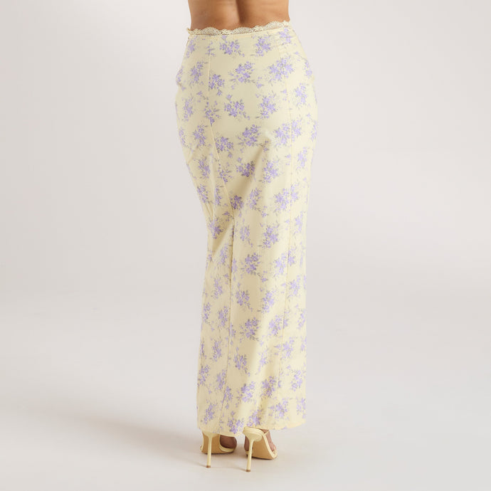 Cotton maxi skirt Slit detail with lace trim Maxi, floor length Full cotton lining Floral print throughout Lace trim to top of skirt Silver tab to back with logo engraving Invisible zip fastening to side Ribbon thread to waistline with drawstring tie Piping channels throughout Part of 'Sophia & Cinzia for Lounge'