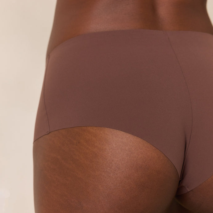 Soft, smoothing stretch fabrication Raw-cut edging with bonded finish Bonded waist and edges