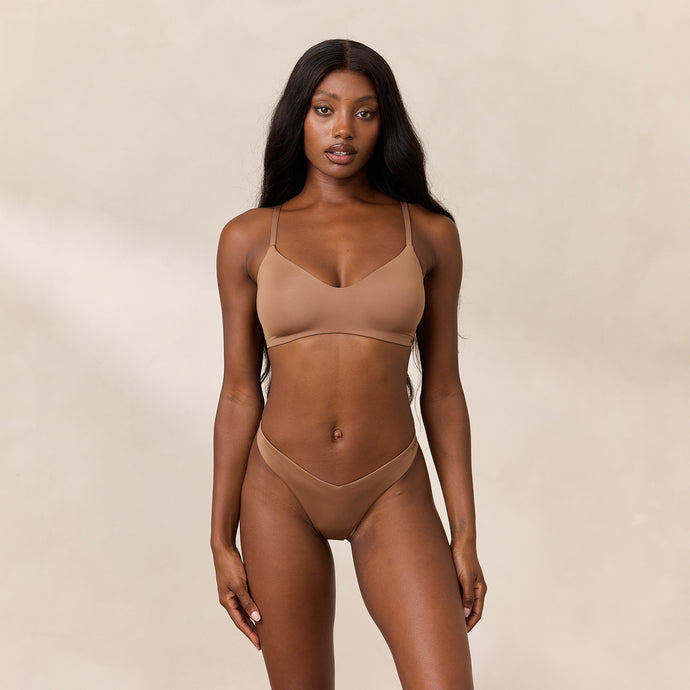 Soft-stretch material Semi-sheer fabrication Subtle silicone Lounge branding Flattering V-shaped waistband