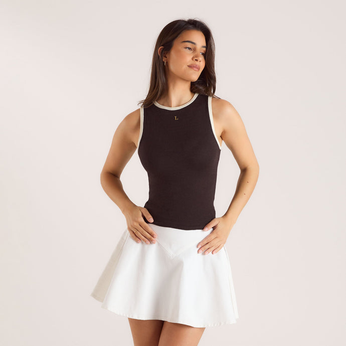Fluted, flared skirt Drop-waist with V-front to both front and back Denim fabrication Tucks along waistline create volume Leather patch with debossed logo Side zip