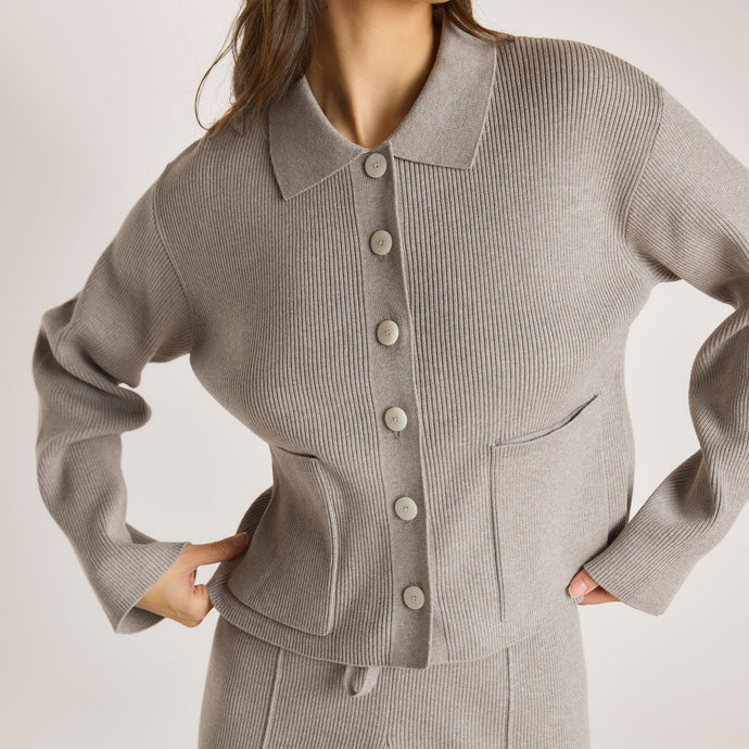 Relaxed-fit knitted shirt with collar Rib knit fabrication 2 pockets to front with hidden embroidered logo branding Mother of Pearl effect iridescent buttons with logo engraving