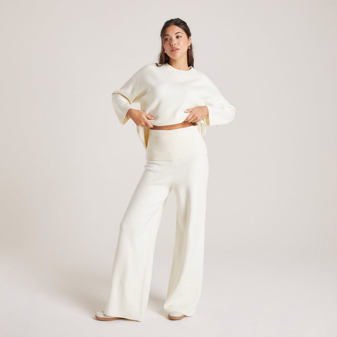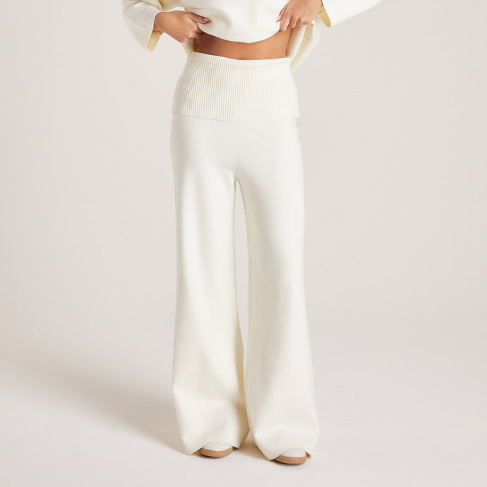 Knitted pants with ribbed roll-waist feature Oversized, wide-leg design Jacquard knit Two pockets to back Appliqué handwritten 'L' logo to back pocket