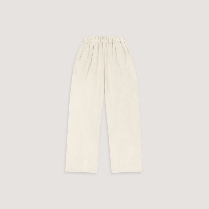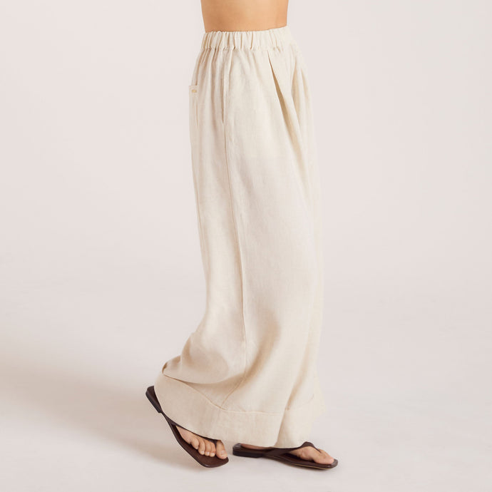Wide-leg trousers Linen fabrication Statement pleat details to front Wide elasticated waist 2 side pockets Wide turn-back hems Pocket detail to back with gold logo engraved tab