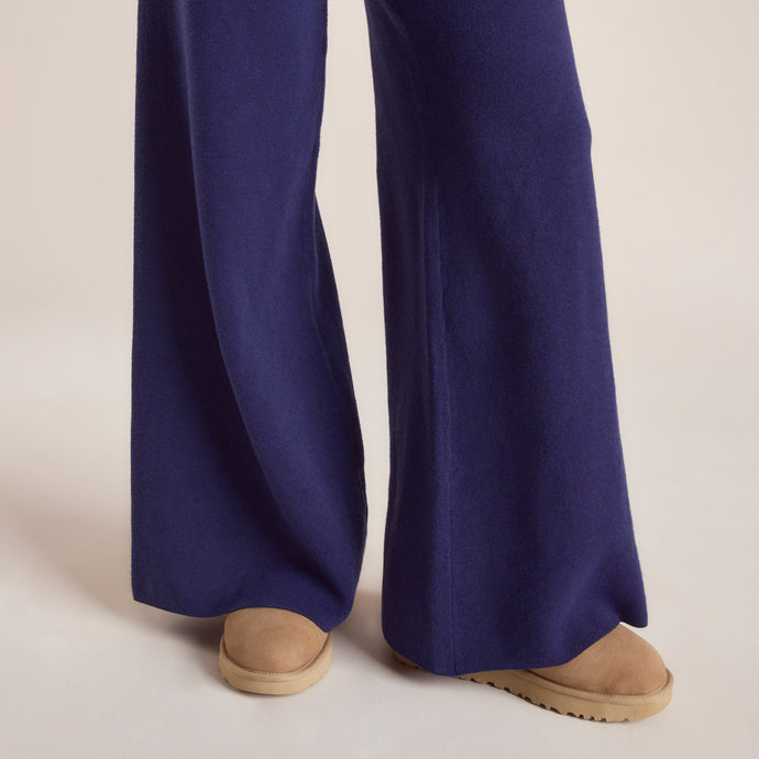 Elasticated ribbed waist Wide-leg style Pocket to back-right Gold engraved logo tab to back pocket Soft knit fabrication