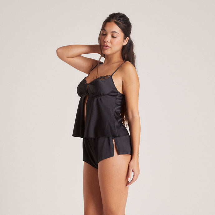 Satin cheeky Pajama shorts Ultra high-leg design Fastens with 2 buttons to top Elasticated waist Extra fabrication to create a flared look