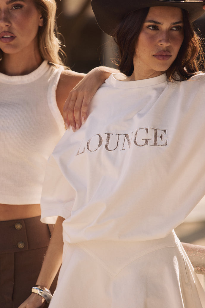 Relaxed, oversized style Soft-stretch cotton fabrication Ribbed neckline Dropped-shoulder style Lounge logo to front with reverse appliqué lace design
