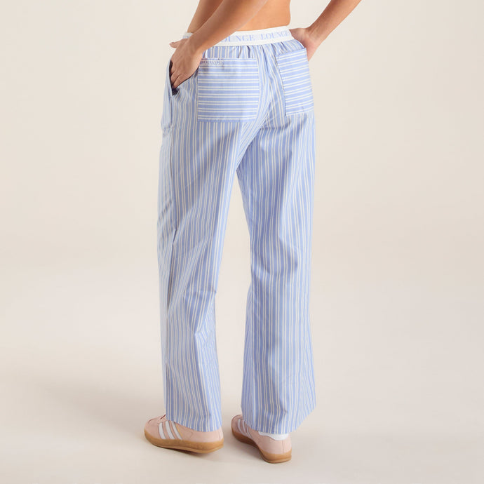 High-waisted, loose-fitting style Lightweight, soft fabrication Pockets Gathered waist with outer drawstring Lounge banner to inner waist, revealed when waistband is rolled down Perfect for morning espressos, evenings al fresco, and everything in between, these pinstripe trousers are everything you need this summer.