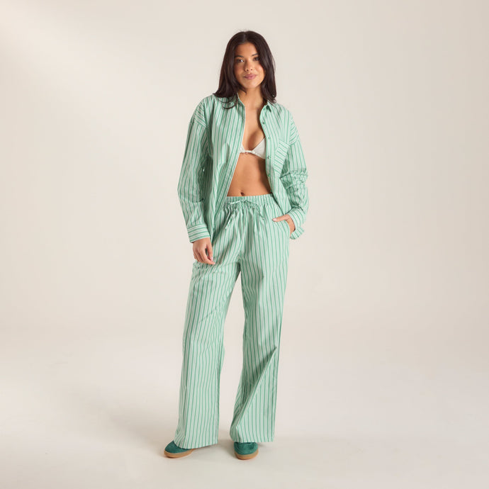 High-waisted, loose-fitting style Lightweight, soft fabrication Pockets Gathered waist with outer drawstring Lounge banner to inner waist, revealed when waistband is rolled down Perfect for morning espressos, evenings al fresco, and everything in between, these pinstripe trousers are everything you need this summer.