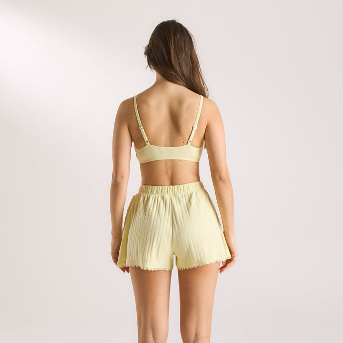 Soft pointelle fabrication – 205 GSM Ruching detail to centre-front for added shape Adjustable straps Woven label with Lounge logo Rosebud detail to centre-front Lace trim