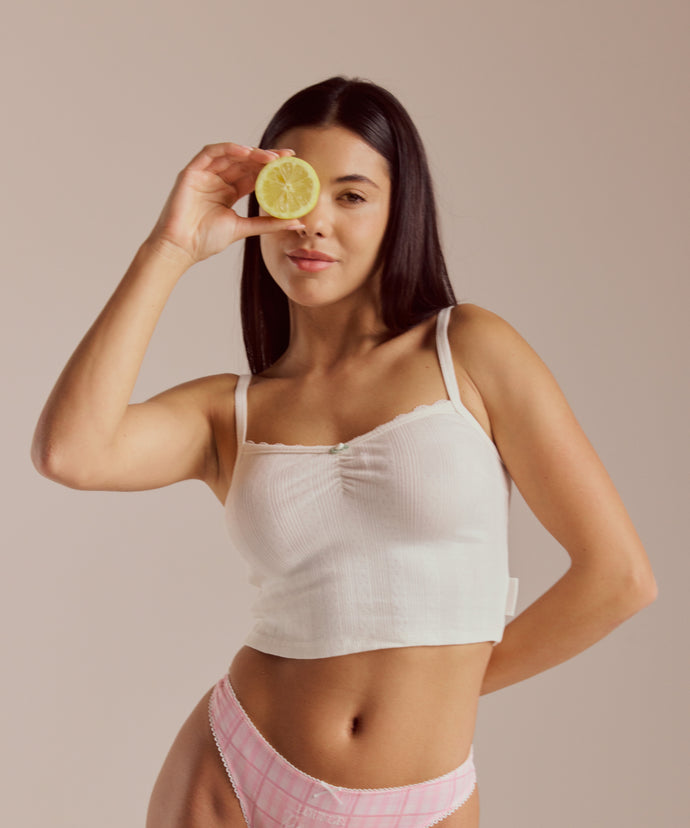 Soft pointelle fabrication – 205 GSM Ruching detail to centre-front for added shape Woven label with Lounge logo to side Rosebud detail to centre-front Lace trim to neckline