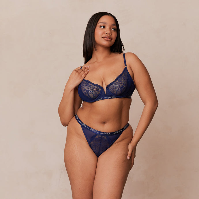 Underwired bra with 'V' detail, no padding Geometric soft stretch lace Hook and eye fastening Adjustable Lounge embossed straps Silver Lounge engraved hardware Cut out detail on centre back of thong Lounge branded banners 61% Recycled Polyamide, 21% Polyamide, 18% Elastane Our Royal Set features a sexy plunge 'V' wire
