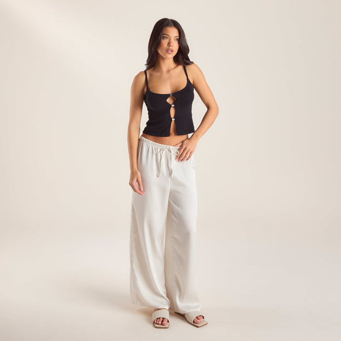 Low-rise, loose-fitting style Lightweight, soft satin fabrication Pocket Elasticated drawstring waist Elevate your evening outfits with these summery satin trousers. With an elasticated waist and relaxed fit, they create a beautifully flattering silhouette.