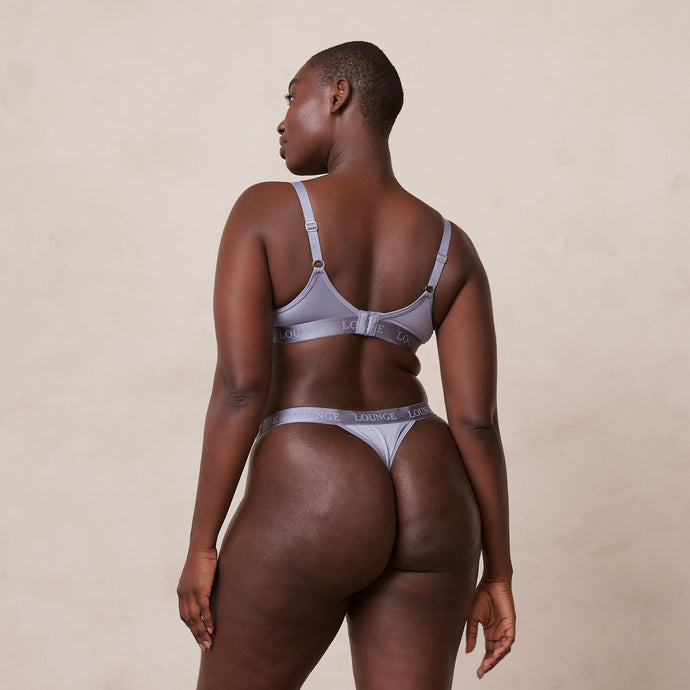 Medium foam padded bra Buttery soft curved fabrication Hook and eye fastening Silver Lounge engraved hardware Supportive Lounge banner with minimal branding 65% Recycled Polyamide, 35% Elastane Lounge with peace of mind in our Sleek Mindful Set. Designed with buttery soft textures, this set will inspire you to embrace