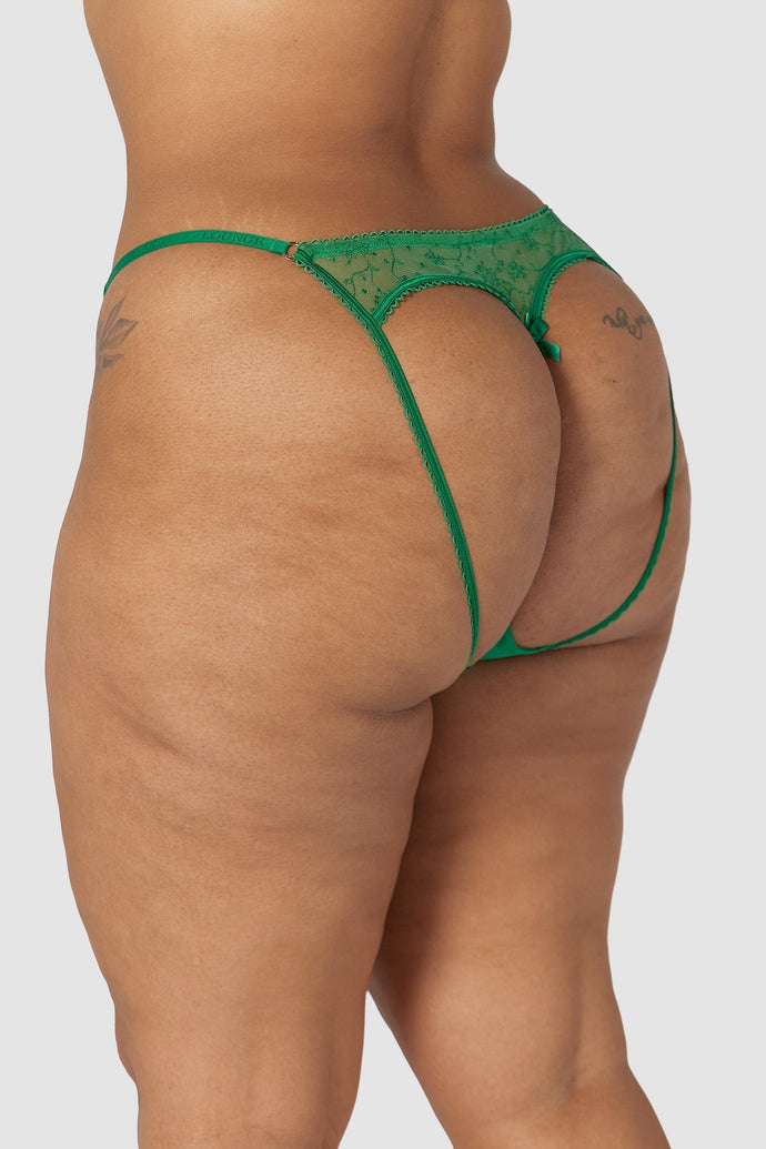 Floral embroidery with glitter lurex thread Decorative picot trimming and satin fabrication Cut out feature with bow detail Lounge woven banner Rosegold Lounge engraved hardware 55% Recycled Polyester, 41% Polyester, 4% Elastane Introducing our new Slinky Open Back Briefs. Add a bit of cheekiness to your underwear draw