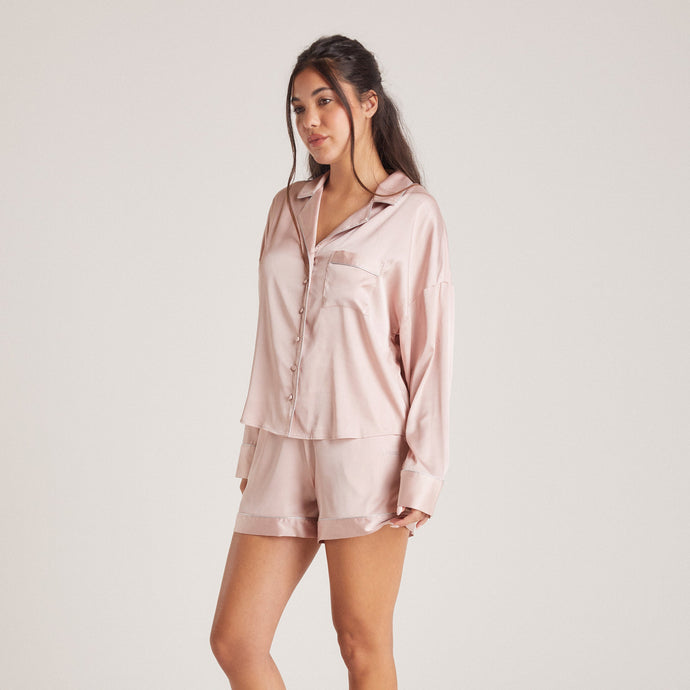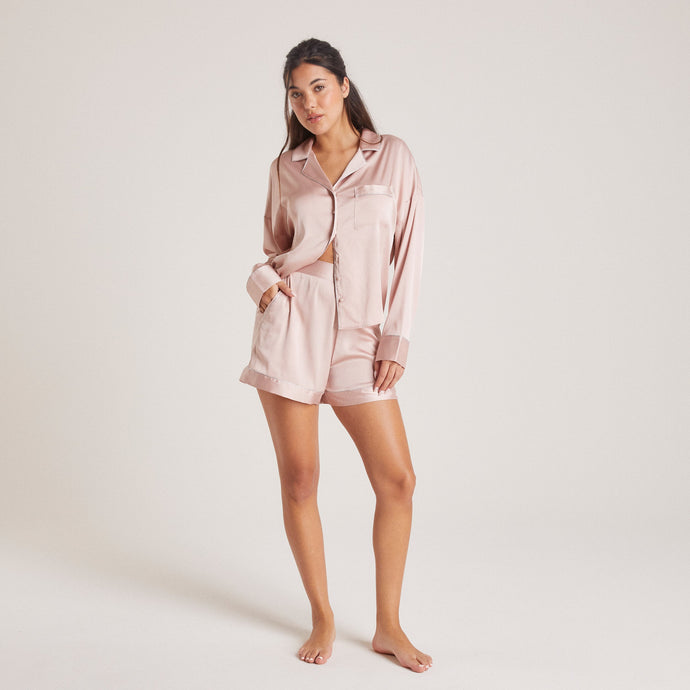 Soft satin Pajama shirt Satin-covered buttons Silver sparkle piping detail to collar, cuffs, and length of shirt Pocket to chest Embroidered Lounge logo to centre-back Pleat to centre-back