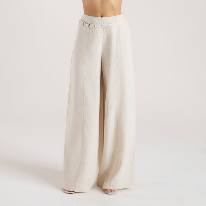 Wide-leg linen trousers Wide turn-up hem Contrast-colour top-stitch detailing Invisible zip fastening to side Attached, fitted belt to front Top-stitch details to leg length Engraved silver eyelets with logo engraving to belt buckle Straight stitch detail to inner waist Pocket welts to back