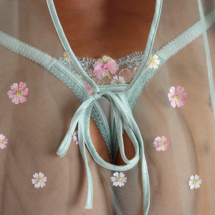 Balcony wired babydoll, no padding Four-piece cup Visual printed embroidery with sparkle lurex thread Jacquard satin binding finishes Mesh panels Visual printed all-over embroidery to skirt Foam embossed padded hook and eye fastening Organza and satin bow with embroidered floral charm with sequin bead detailing Self-ti