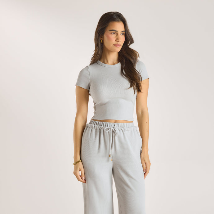 Ultra-soft round-neck baby tee Fitted, high neckline style Stretch waffle fabrication Brushed gold tab with logo engraving